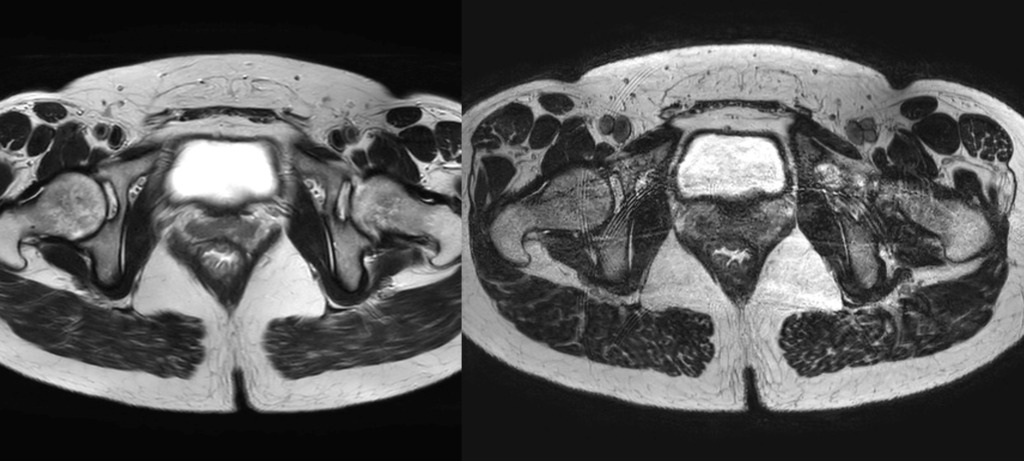 従来の撮像プロトコルでは、T2WIの軸位(Axi)および斜位冠状(obl-Cor)画像を中心に3mm厚で撮影されていました。しかし、2020年以降、多くの施設で共同研究用の新プロトコルが採用され、撮像技術は大きく進化しています。近年では**高分解能撮像(High Resolution: 0.6mm×0.6mm)**が可能となり、微細な構造の識別がより明確になっています。また、撮像時間の短縮と高画質化を両立させるため、SSFSE(Single Shot Fast Spin Echo)にDLR(Deep Learning Reconstruction)を組み合わせた撮像が導入され、骨盤全体像をわずか30秒以内で取得できるようになっています。さらに3D-T2WでもDLRを併用することで、三次元的な再構成による腫瘍の立体的把握が容易となりました。