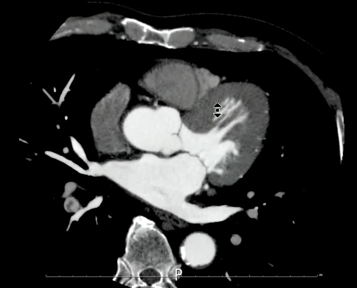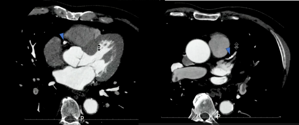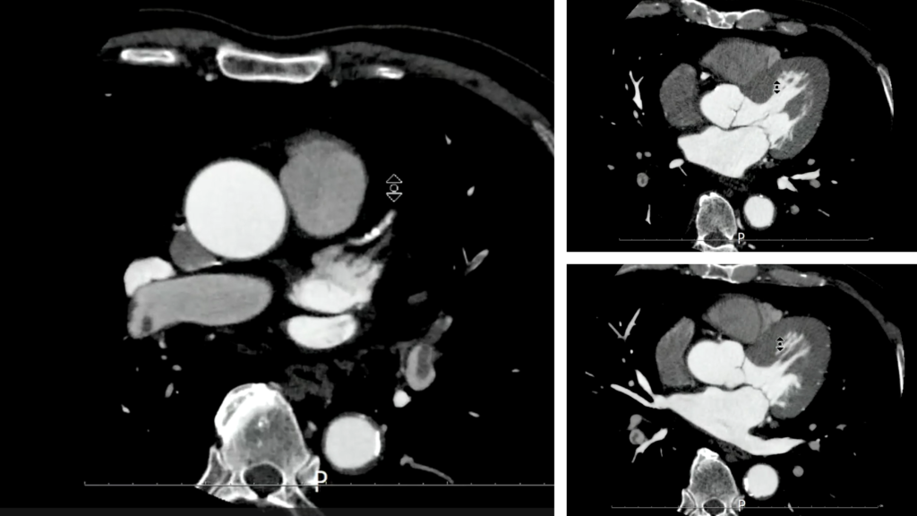 →当院での検査結果で明らかな心機能異常や右心負荷所見は認められないが、心電図所見や基礎疾患を考慮して冠動脈CTの依頼となりました。