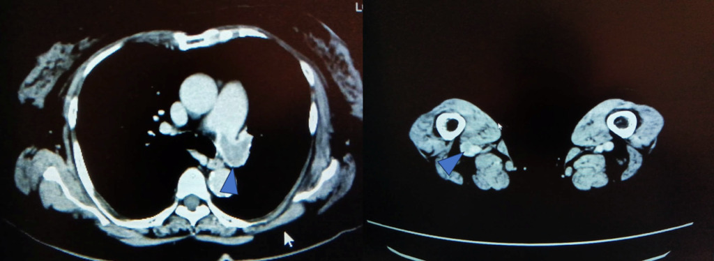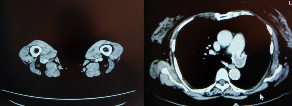 この方は検査前情報にはなかったのですが、右のTKA術後の方でした。右膝関節術部周囲を主体に下腿~大腿骨遠位レベルにfilling defectが複数認められました。