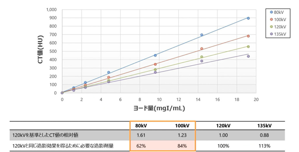 120kvで撮影した時の造影剤のCT値を1とした時の相対値では低電圧にするとCT値が1.6と上がり、120kvでの撮影した時と同じ造影効果を得るために必要な造影剤量も62%と減らせます。