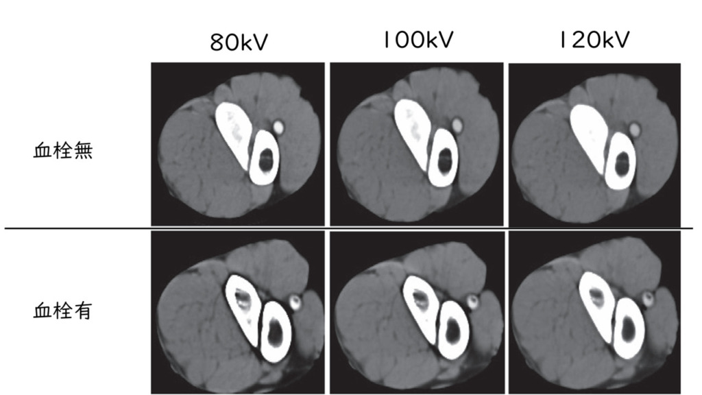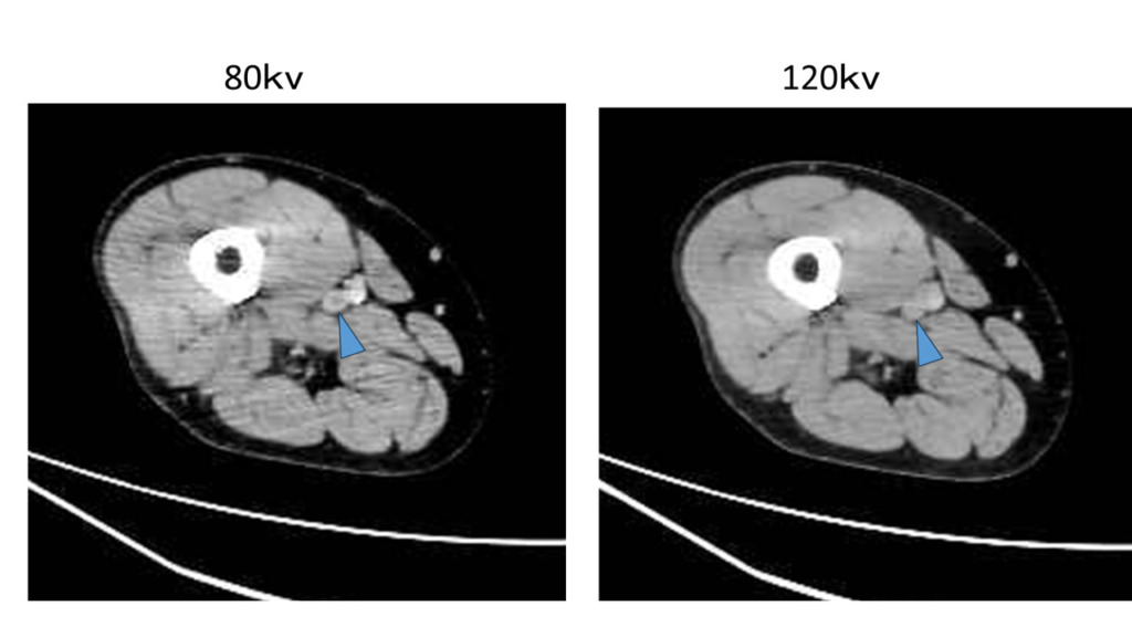 その他にも低電圧で撮影するので光子量が減るため、被ばく量が少なくなるというメリットもありますが、ただし注意が必要なのは電圧を下げることによって透過するエネルギーが低くなるので120kvと比較するとノイズが多くなります。