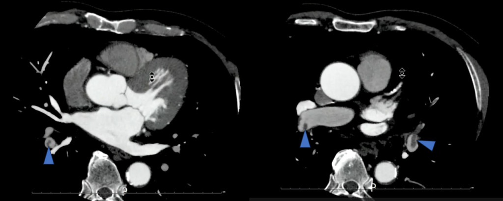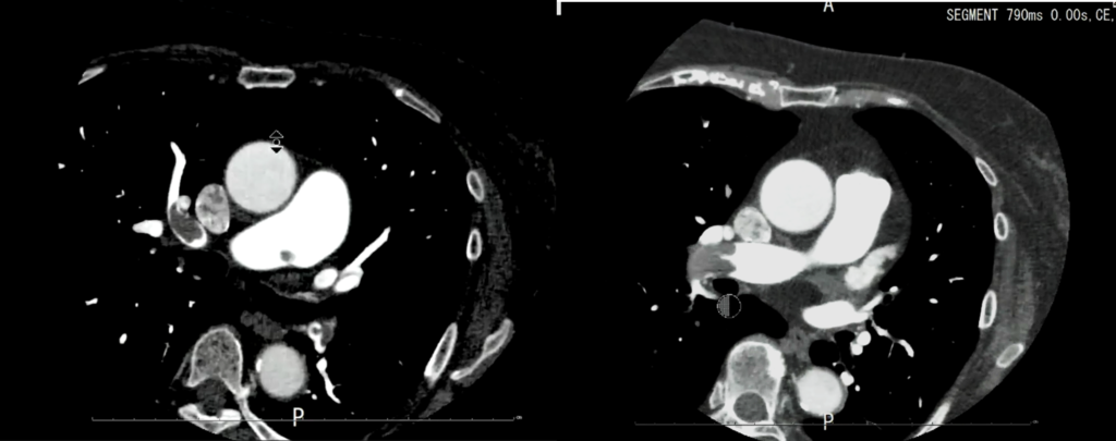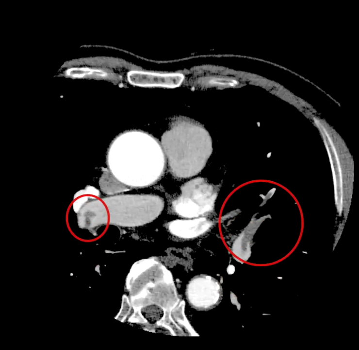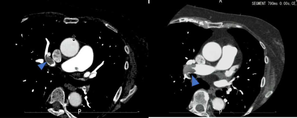 これを見ると、冠動脈CTでは右肺動脈に大きい血栓があるように見えましたが、左肺動脈の方が血栓サイズが大きく、これによる左胸の痛み症状だったのではないかと考えられました。