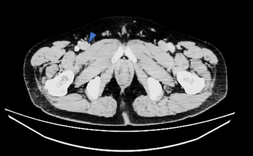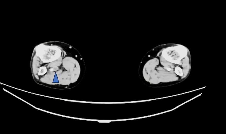現場で症例に気づき、寝台から降ろさずに放射線科に相談し腎機能低下していることから追加造影は行わずに管電圧を低くして撮影に対応し、病変部が観察できた症例になります。