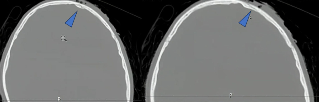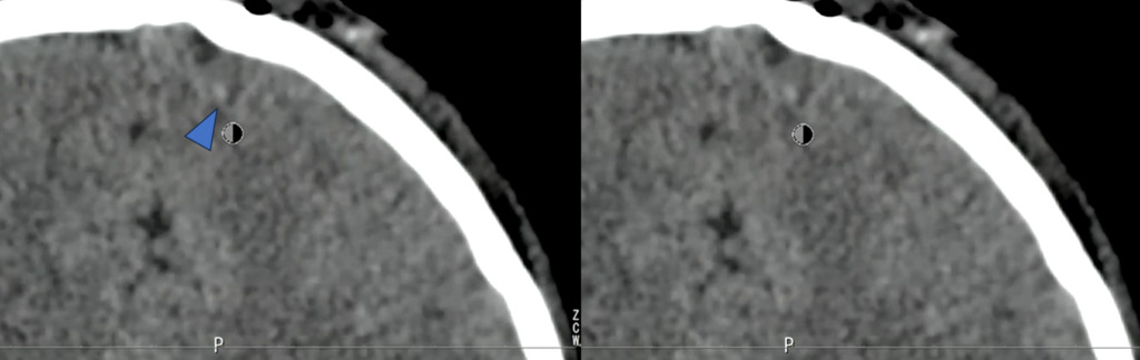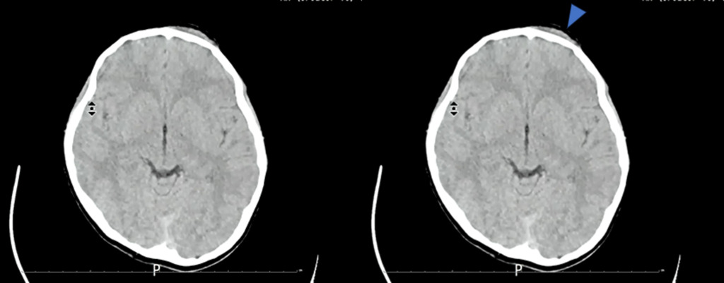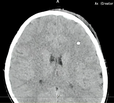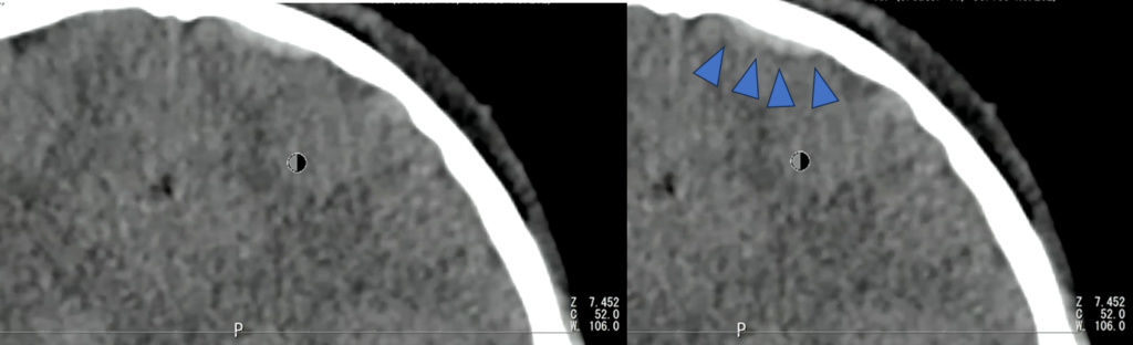 受傷日と翌日のCTと比較すると、確かに出血が顕在化し、目立っておりわずかな硬膜下血腫もしくはくも膜下血腫と脳挫傷の可能性があると再読影をしました。