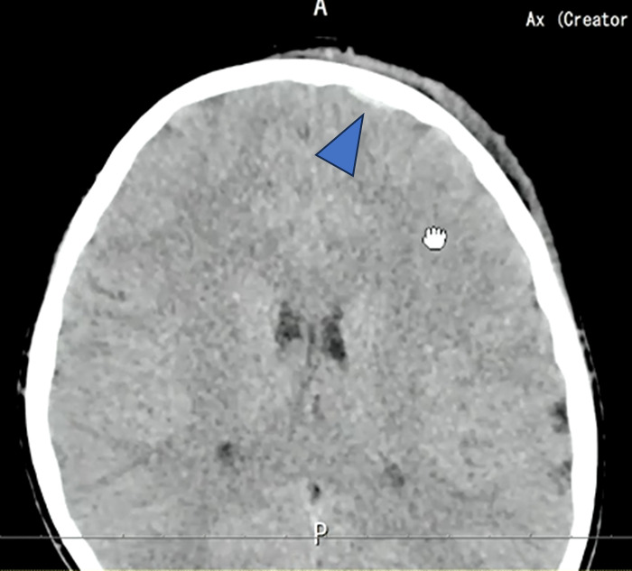 わずかに高吸収域を認めます。外傷後の外傷性硬膜下出血と思われます。